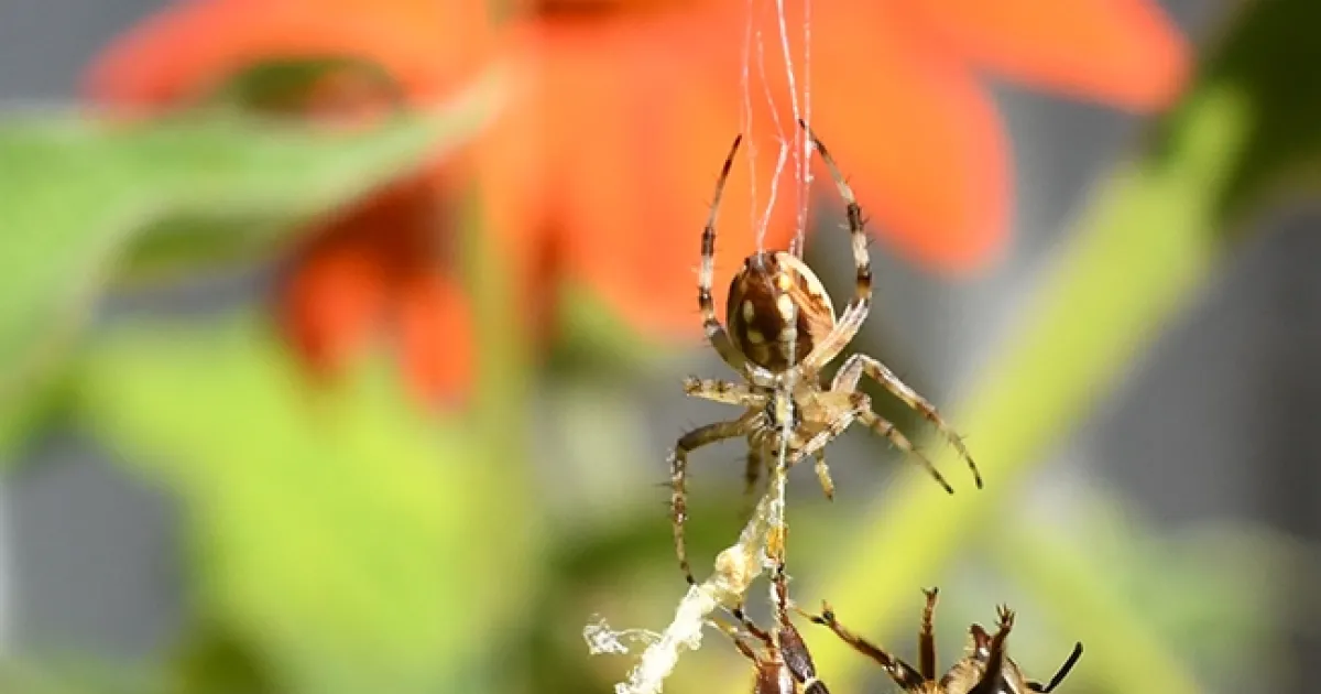 The spider is not alone. It soon has unexpected dining partners: tiny freeloader flies (family Milichiidae) who did no work but insist on their share of the free food.