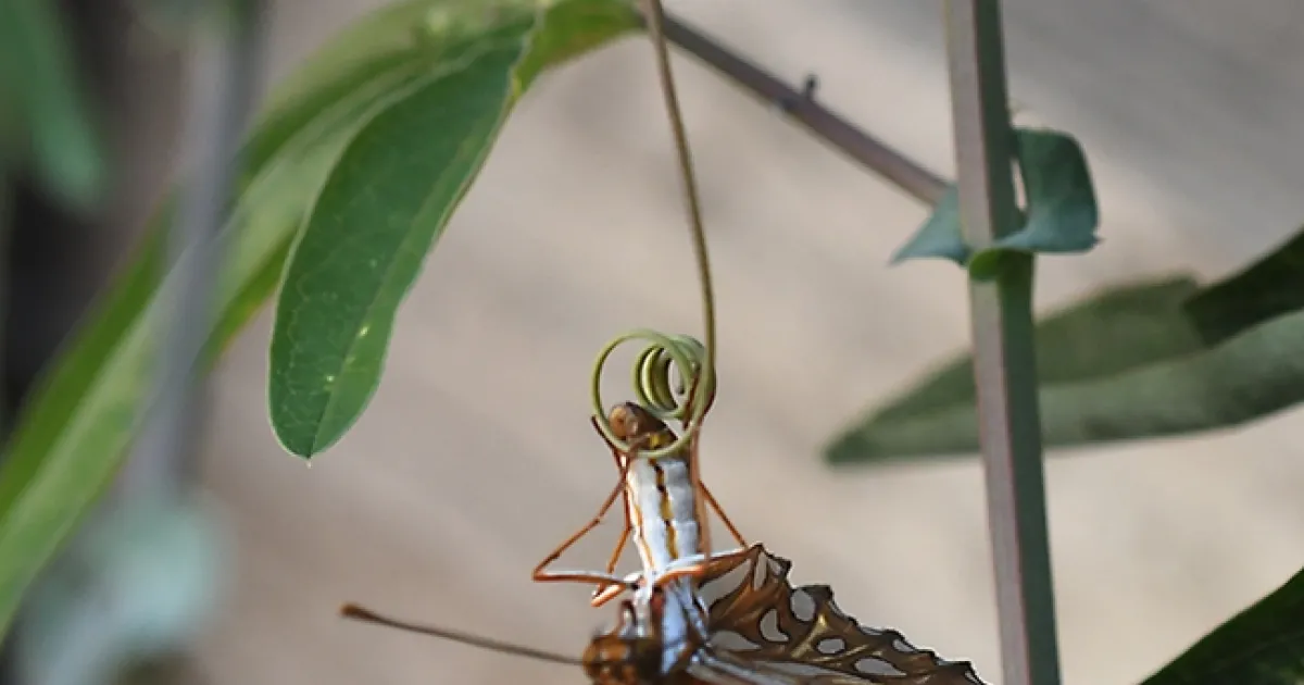But Gulf Fritillary butterflies, Agraulis vanillae, don't always lay their eggs on the tendrils of their host plant, the passionflower vine (Passiflora) although textbooks may indicate that.