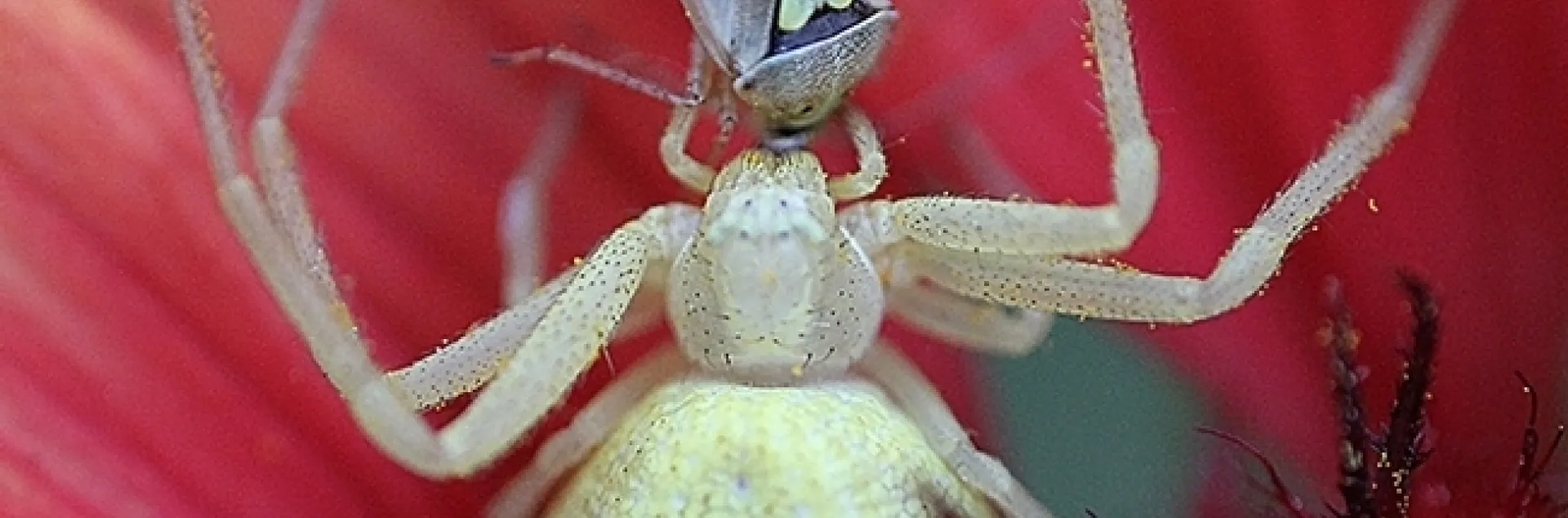A crab spider eating a lygus bug, an agricultural pest in a Vacaville garden. (Photo by Kathy Keatley Garvey)