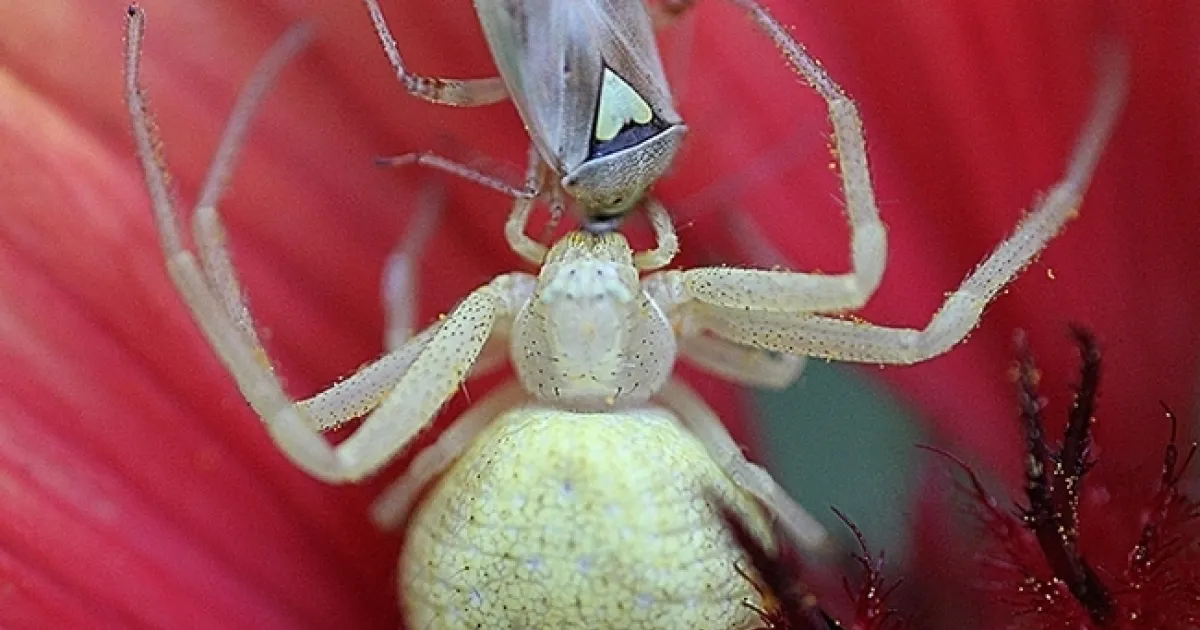 Let's especially applaud crab spiders when they prey on such agricultural pests as the lygus bug, also known as the "western tarnished plant bug." It's a member of the genus Lygus in the family Miridae and feeds on plants by piercing the plant tissues.