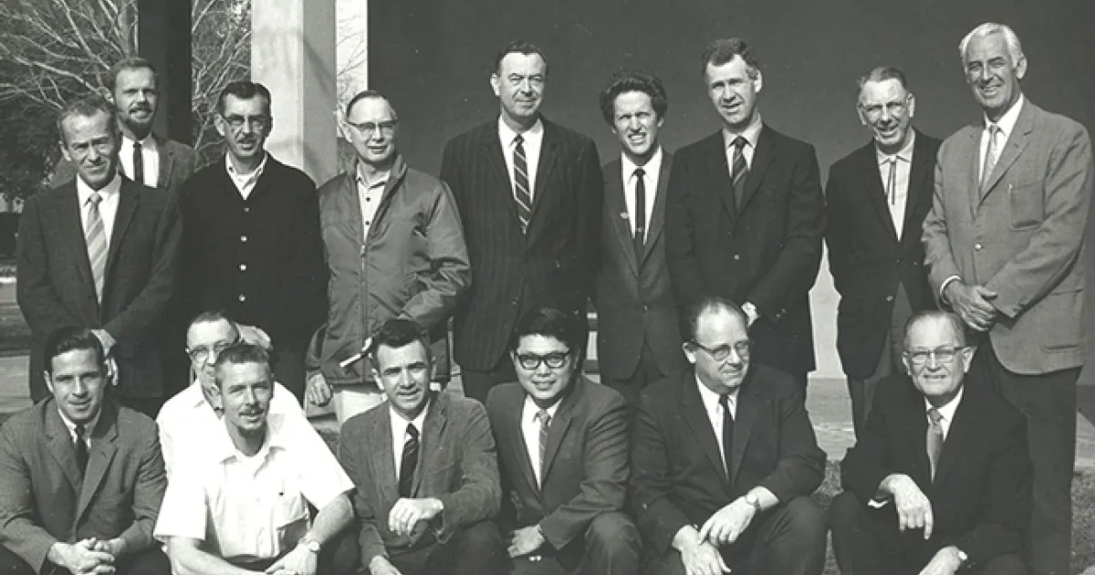 The UC Davis Department of Entomology, Feb. 3, 1970. In front (from left) are Dick Bushing, Frank Summers, Bob Schuster, Al Grigarick, Bob Washino, Harry Lange and Harry Laidlaw. In back (from left) are Charles Judson. Robbin Thorp, Vern Burton, Elmer Carlson, Oscar Bacon, Frank Strong, Don McLean, Ward Stanger and Ed Loomis. Among faculty not pictured: Stanley F. Bailey, R. M. Bohart, Warren R. Cothran, Norman Gary, G. A. H. McClelland, Howard McKenzie and Gene Stafford.
