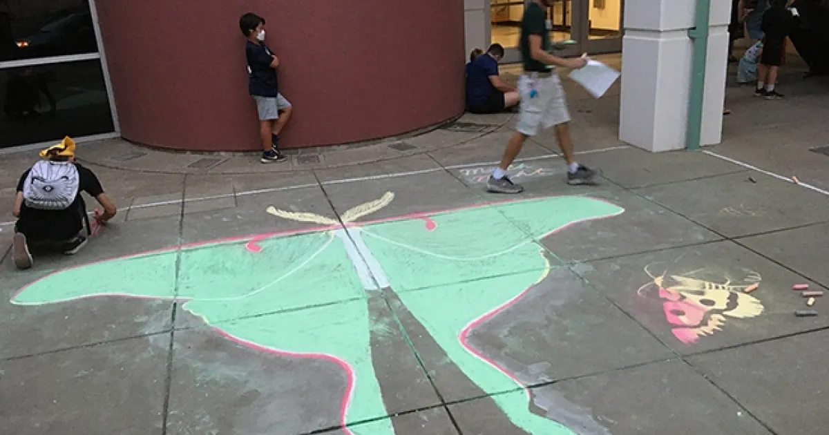 Chalk art of a Luna moth graced the entrance to the Bohart Museum of Entomology at UC Davis on Moth Night. (Photo by Tabatha Yang)