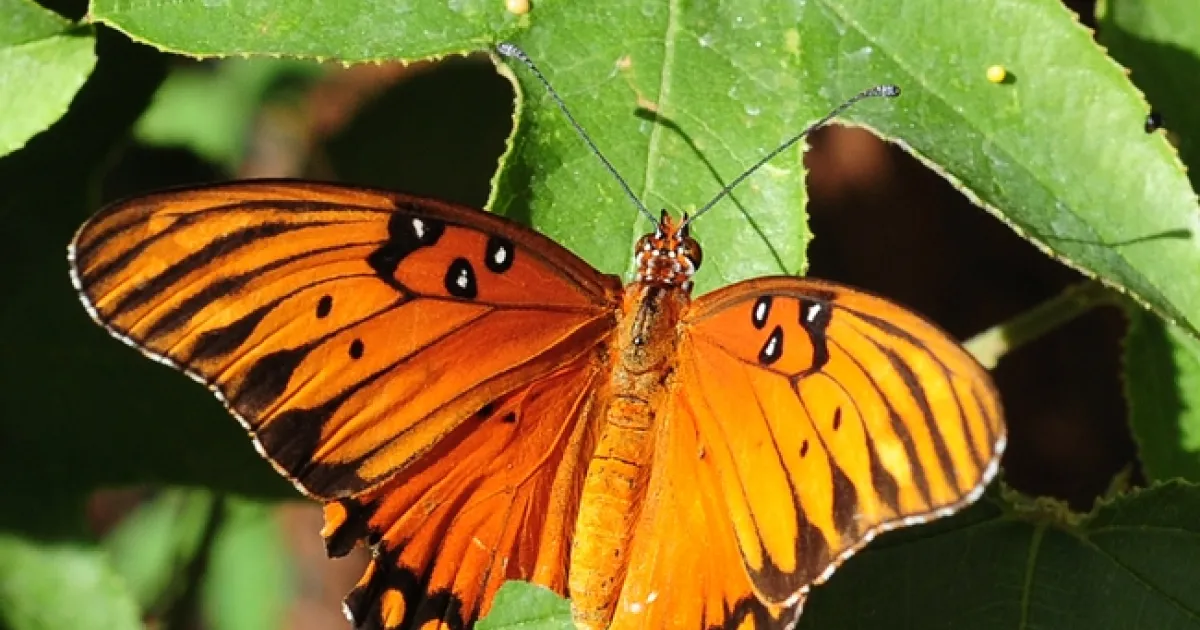This particular Gulf Fritillary landed on its host plant, a passion flower vine (Passiflora) last Sunday and then fluttered off, only to be replaced by scores of others. They were laying eggs on the plant.