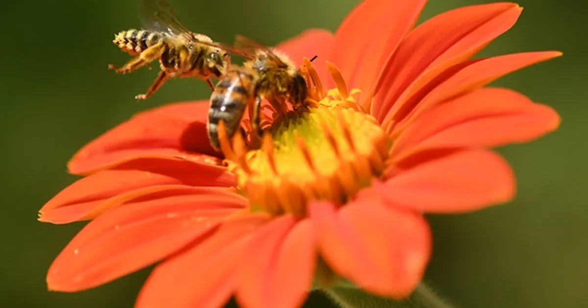 A male long-horned bee, Melissodes agilis, targets a honey bee nectaring on a Mexican sunflower, Tithonia rotundifola. This was shot with a shutter speed set at 1/5000 of a second. (Photo by Kathy Keatley Garvey)
