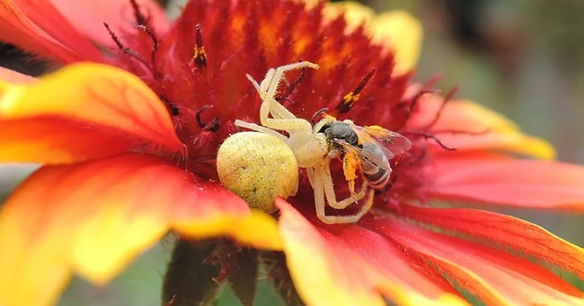 A crab spider dining on a bee on a blanketflower, Gallardia. Everyone eats in the garden. (Photo by Kathy Keatley Garvey)