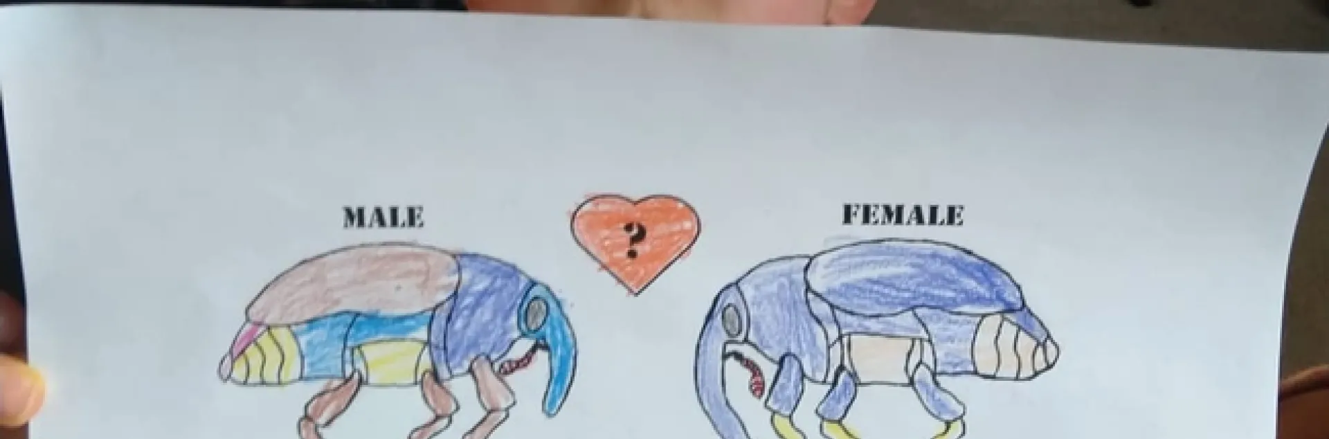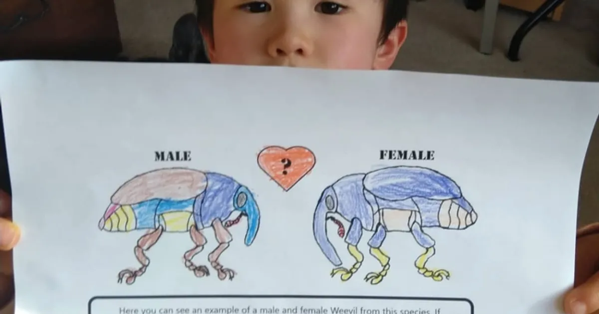 Another page: "Here you can see an example of a male and female weevil from this species. If you look closely, you will see that they have different looking trunks, also known as rostrums. This is an example of dimorphism, where individuals of the same species may follow one of two variations in body shape, size or color In this case, the male weevil has a shorter rostrum, while the female's rostrum is much larger. But I think both are equally cute!"