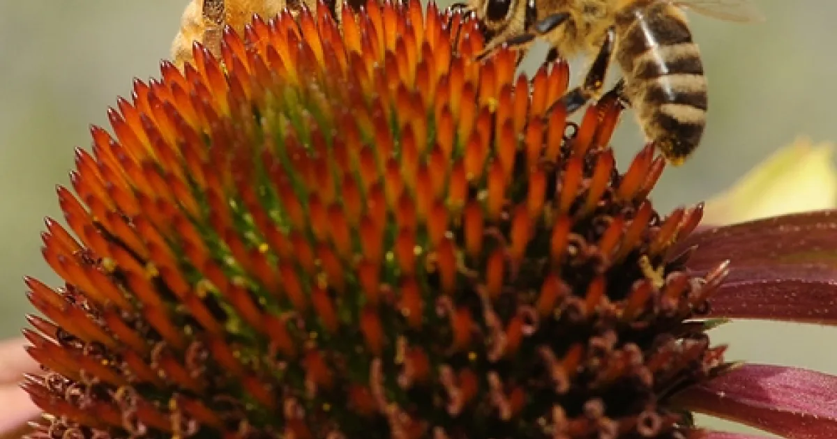 TOUCHING--An Italian bee (left) and a New World Carniolan brush against one another on a purple coneflower in the Haagen-Dazs Honey Been Haven at UC Davis. (Photo by Kathy Keatley Garvey)