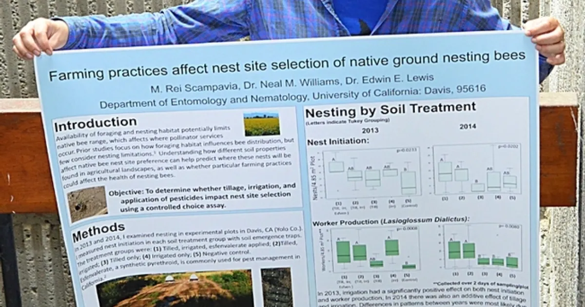 Margaret “Rei” Scampavia, a doctoral candidate who studies with major professors Neal Williams and Edwin Lewis of the Department of Entomology and Nematology, won first place for her research poster at the recent UC Davis Bee Symposium, held in the Robert Mondavi Center for Wine and Food Science.