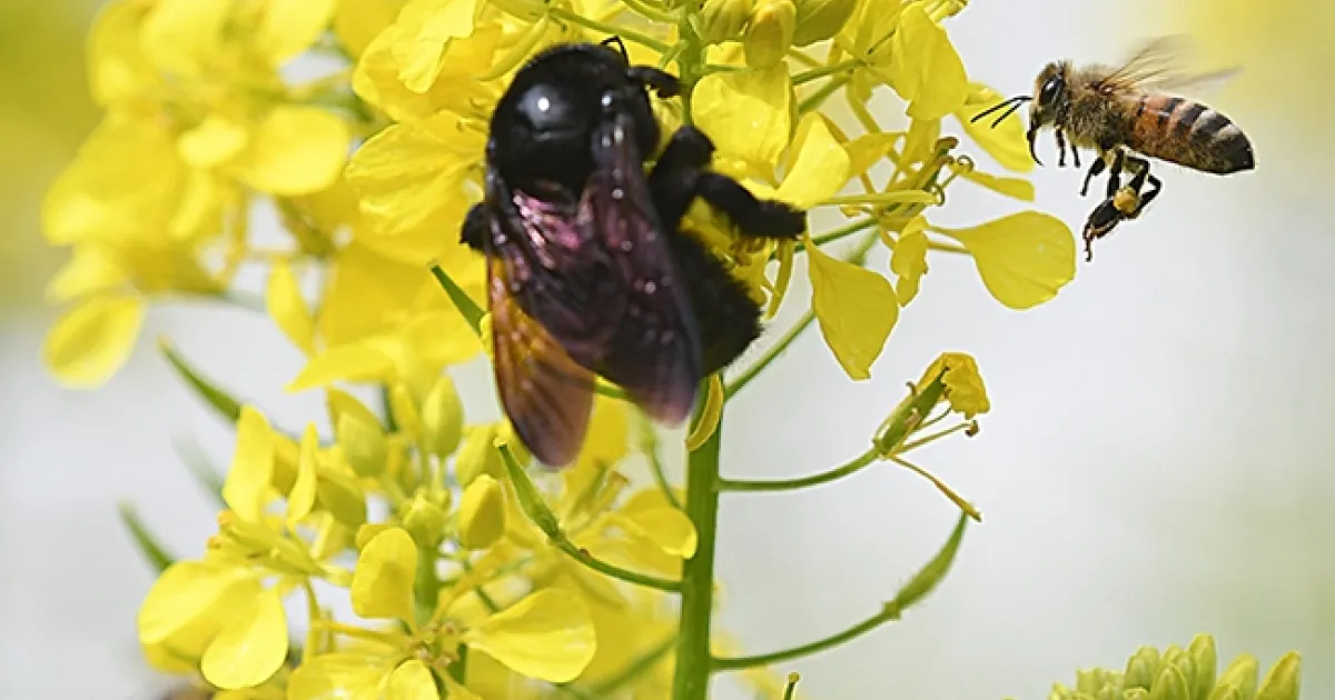 A honey bee comes faces to face with a Valley carpenter bee on a mustard blossom. The Valley carpenter bee is native to the United States, while the honey bee is native to Europe. (Photo by Kathy Keatley Garvey)