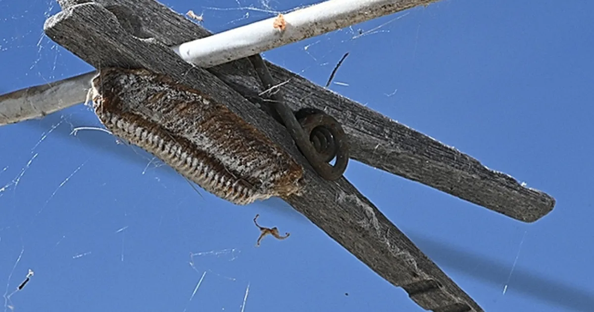 We first noticed the camouflaged ootheca (aka eggcase or ooth) on the wooden clothespin in mid-March when we were hanging a freshly laundered dog blanket on the line.