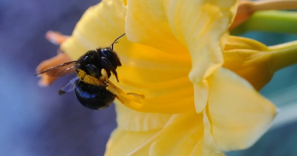 Blue sky, yellow lily, yellow pollen on a magnum-black carpenter bee.