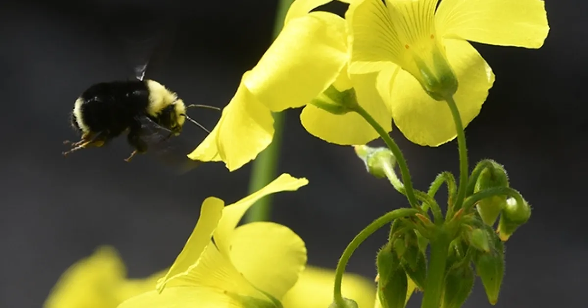 The Bombus vosnesenskii, caught in flight, targets oxalis in Benicia. (Photo by Kathy Keatley Garvey)
