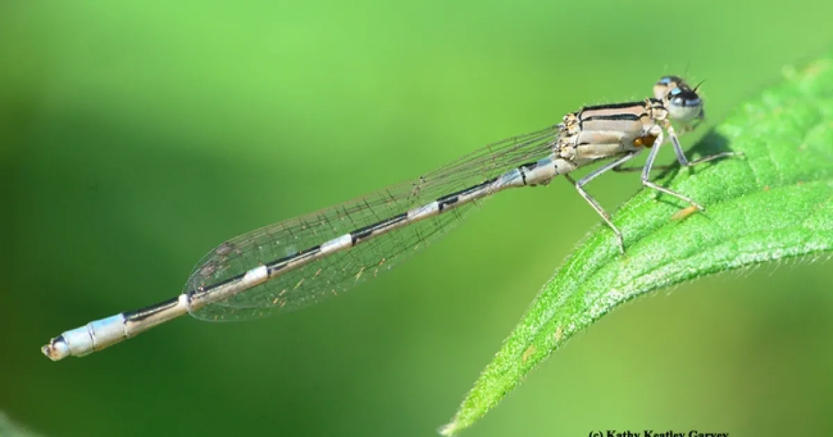 Damselfles and dragonflies belong to the same order, Odonata. Damselflies, however, are typically much smaller than their dragonfly cousins. Wikipedia tells us that damselflies, suborder Zygoptera, can be distinguished from dragonflies "by the fact that the wings of most damselflies are held along, and parallel to, the body when at rest. Furthermore, the hindwing of the damselfly is essentially similar to the forewing, while the hindwing of the dragonfly broadens near the base.