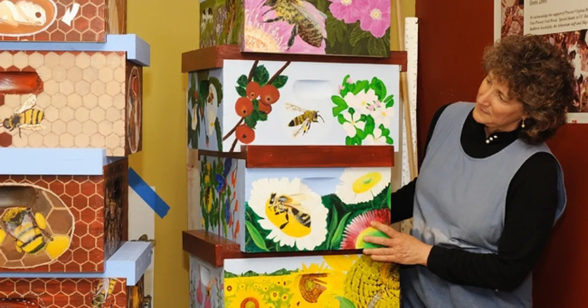 Diane Ullman looking over students' work. The colorful bee boxes were then moved over to the Haagen-Dazs Honey Bee Haven on Bee Biology Road, UC Davis. The UC Davis Department of Entomology and Nematology operates the garden. (Photo by Kathy Keatley Garvey)