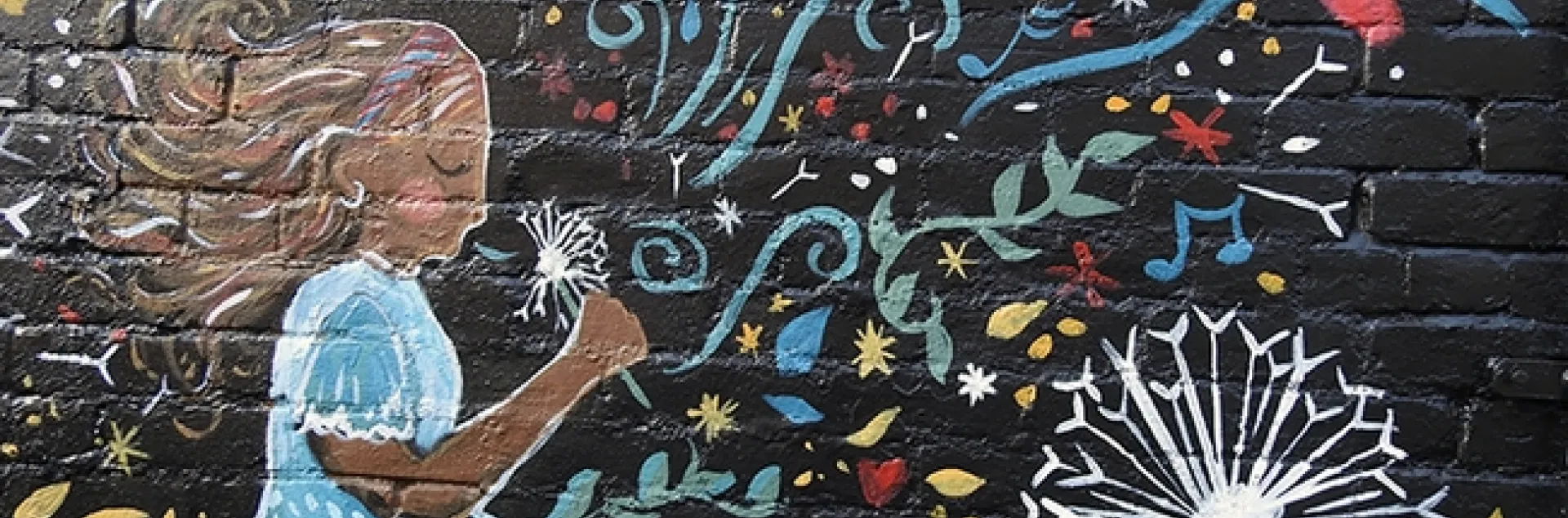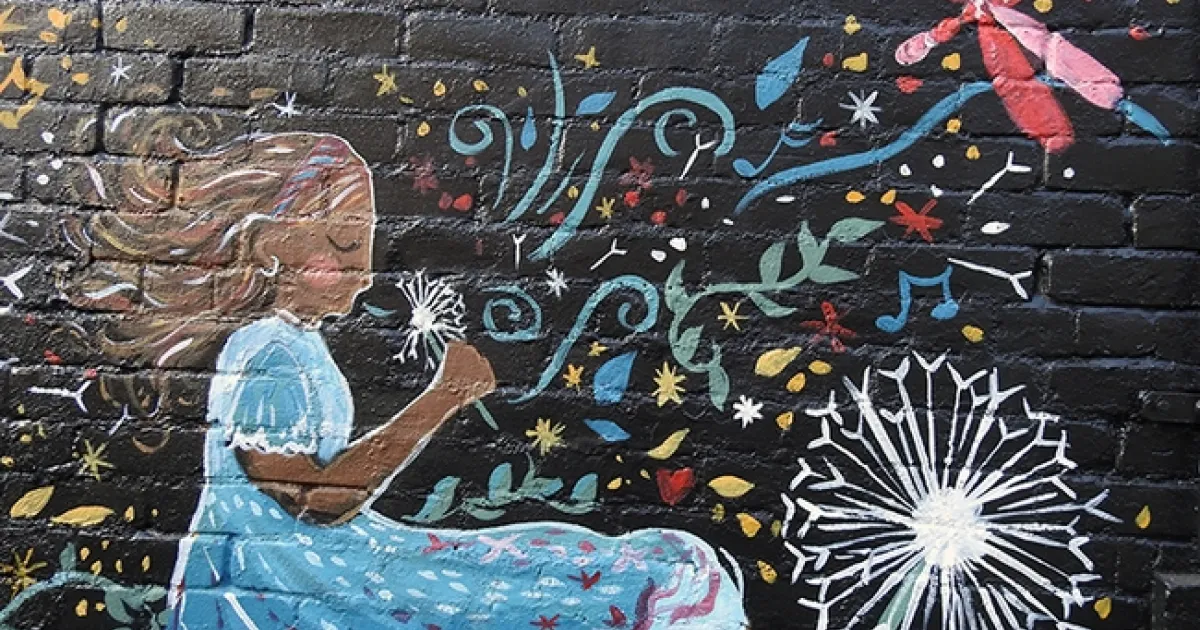 Her mural shows a young girl in a billowing blue dress blowing the seeds off a dandelion--perhaps she's making a wish?--while a flameskimmer dragonfly zigzags away.