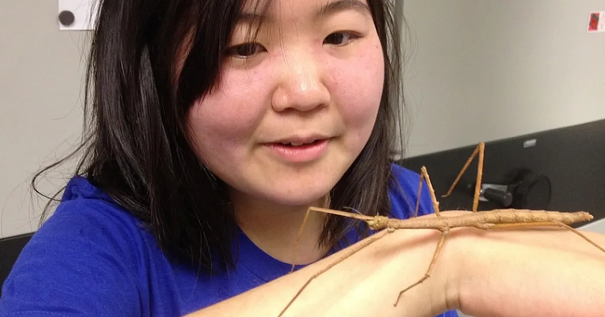UC Davis undergraduate student Ivana Li with a walking stick. She's an entomologist, an artist, and president of the UC Davis Entomology Club. (Photo by Kathy Keatley Garvey)