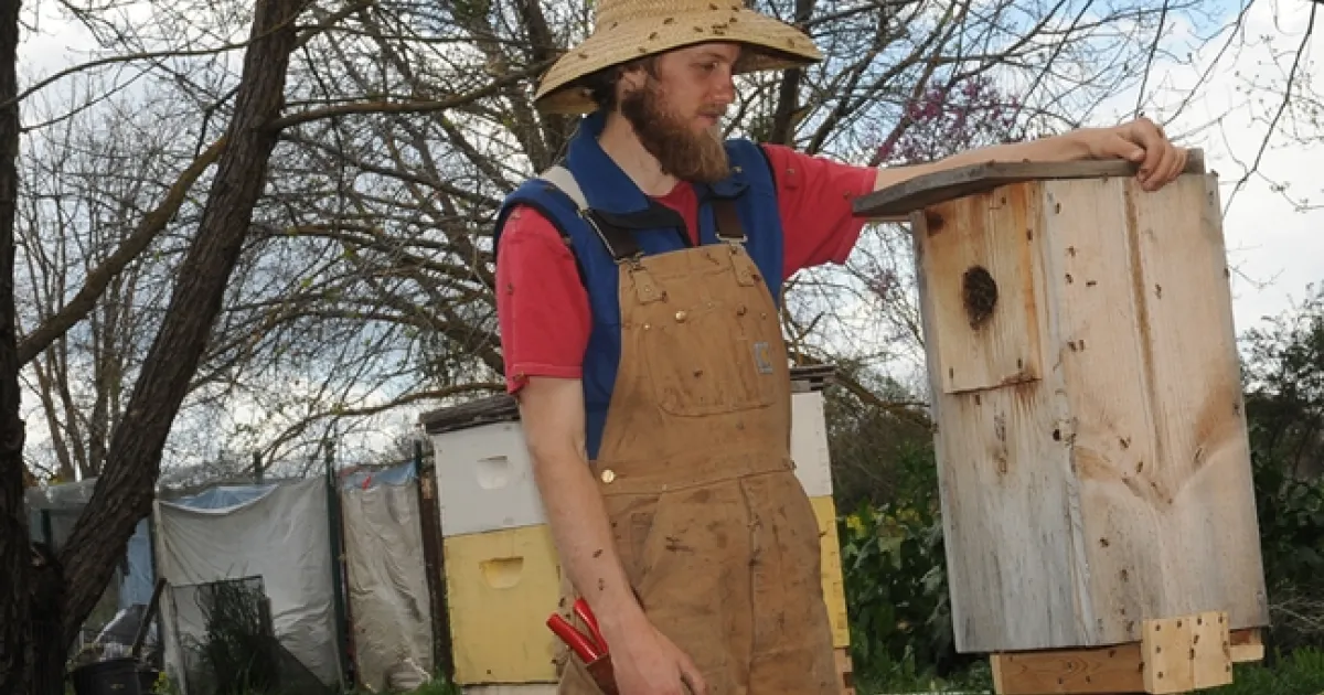 This wood duck box is being used as a bee hive in The Bee Sanctuary on the UC Davis campus. Examining it is Derek Downey who directs The Bee Collective and The Bee Sanctuary. (Photo by Kathy Keatley Garvey)