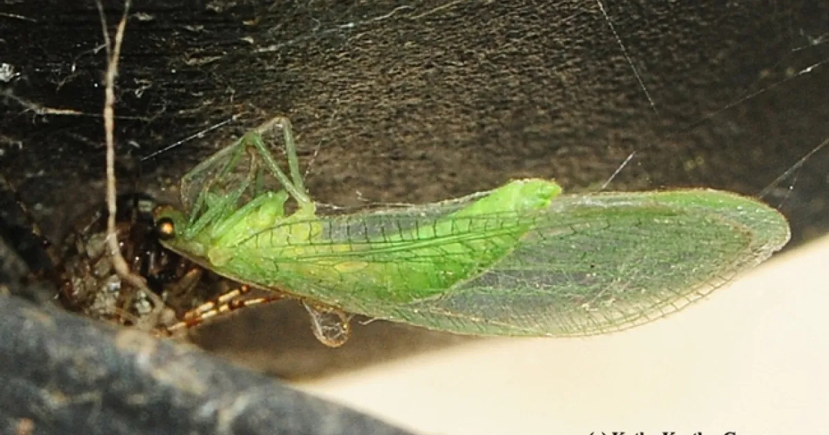 A green lacewing nailed by a garden spider? And on the porch light fixture?