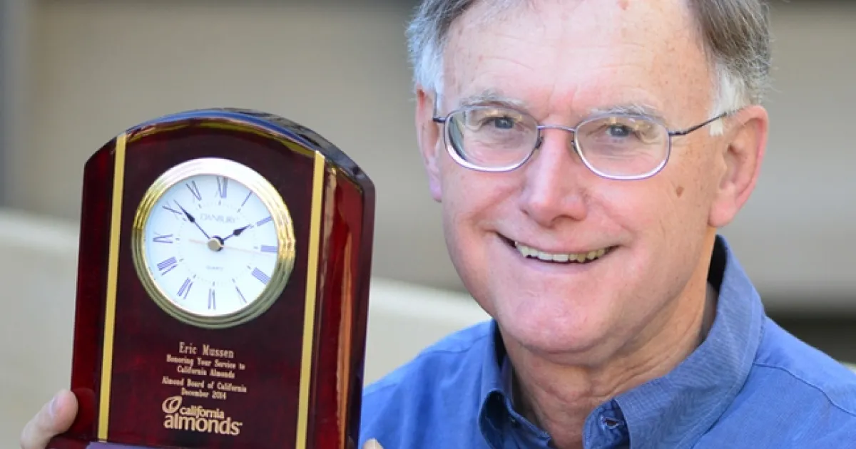 Mussen's latest award is an engraved clock from the Almond Board of California. In presenting him with the coveted award, Robert "Bob" Curtis, associate director of Agricultural Affairs, Almond Board of California, told him: "Eric, we honor your service as a Cooperative Extension Apiculture Specialist. Your leadership has been invaluable to both the almond and beekeeping communities as the authoritative and trusted source for guidance on research, technical, and practical problem solving and issues facing both industries. Even now in your retirement you have been instrumental in the development of Honey Bee Best Management Practices for Almonds and extending this information to all pollination stakeholders."