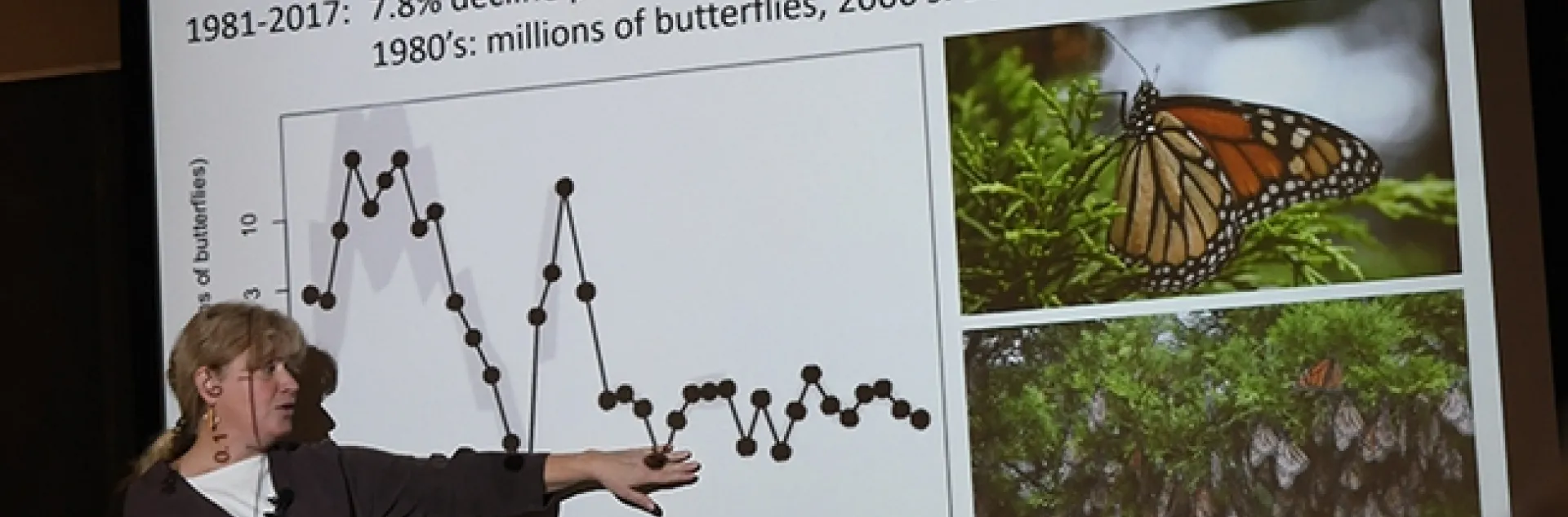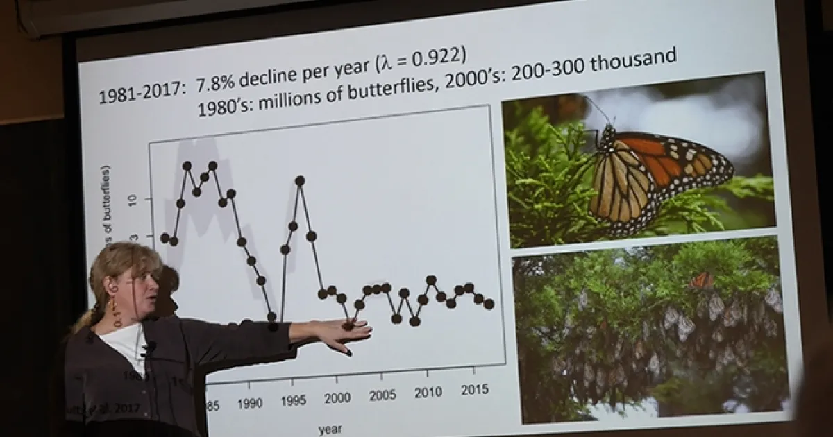 In her UC Davis seminar, Crone pointed out that the population of Western monarchs, which overwinter along the California coast, dropped from an estimated 4.5 million in the 1980s to less than 30,000 in the winter of 2019.