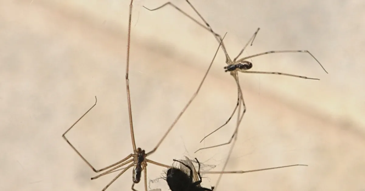 Its life-and-death struggle in our back yard did not escape a trio of cellar spiders (family Pholcidae). They rapidly descended on the squirming fly.