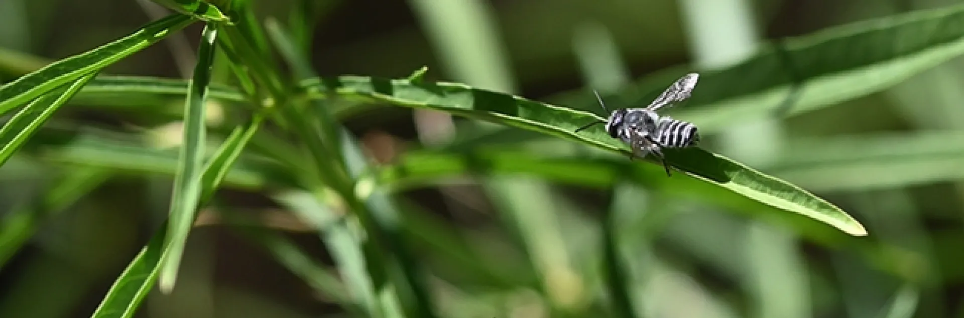 Leafcutter bees, spp., so named because the females cut leaves and petals (perfectly round holes!) to line their nests, are smaller than honey bees--and much faster. They're easily recognizable by the black-white bands on their abdomen.