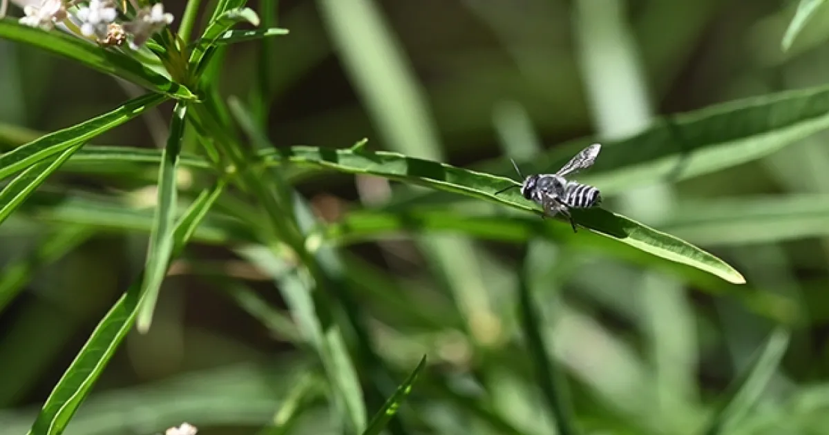 The narrowleafed milkweed, Asclepias fascicularis, beckons monarch butterflies (the host plant), aphids, praying mantids and assorted other insects, but once in a while, you'll see a leafcutter bee. Both the plant and the bee are natives.