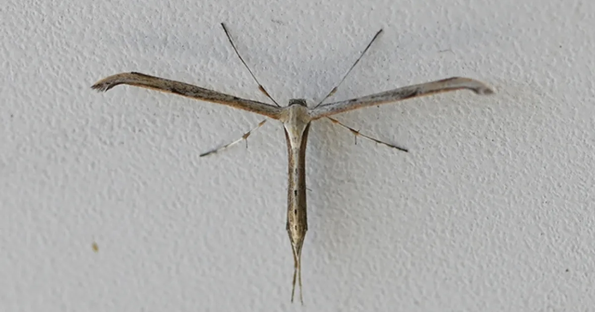 At rest, the plume moth holds its slender wings at right angles to body, giving it a T-shaped profile.