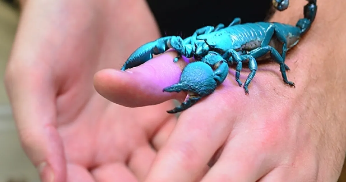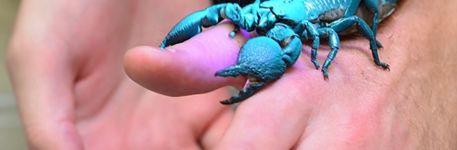 A scorpion fluoresces under ultraviolet (UV) light. See them at the Bohart Museum of Entomology during UC Davis Biodiversity Museum Day. (Photo by Kathy Keatley Garvey)