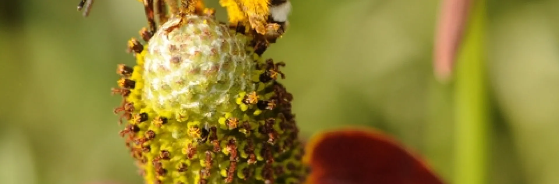 The scarlet red petals of the Mexican hat flower (Ratibida columnifera), droop, leaving plenty of room for dancing on the cone.