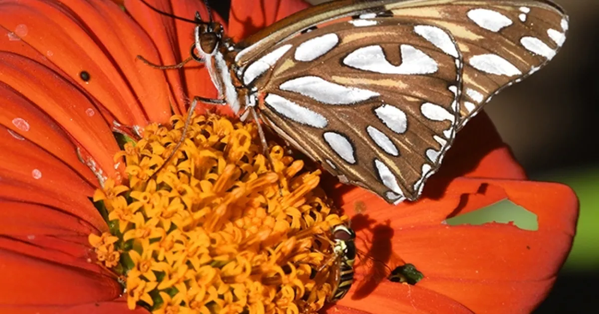 The occasion: a syrphid fly and the Gulf Fritillary (Agraulis vanillae) or passion butterfly are sharing a Mexican sunflower, Tithonia rotundifola, and neither seems bothered that the other is there.