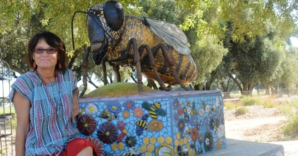 Billick created “Miss Bee Haven,” a six-foot-long honey bee sculpture that anchors the garden. "I like to play with words,” said Billick. She also created the colorful Harry H. Laidlaw Jr. Honey Bee Research Facility's mosaic ceramic sign that features DNA symbols and almond blossoms. A hole drilled in the sign is ready for a bee hive.