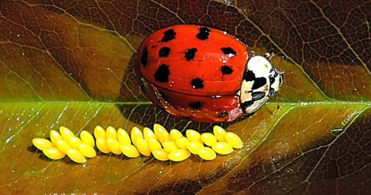 A lady beetle and her eggs in a Vacaville garden. Everything in nature is connected, says Frédérique Lavoipierre. If you have no aphids, no lady beetles or soldier beetles for you. (Photo by Kathy Keatley Garvey)