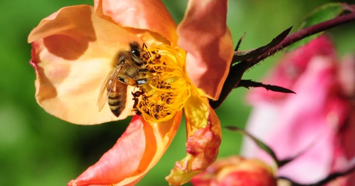 ONE: A sole honey bee visits a rose. (Photo by Kathy Keatley Garvey)