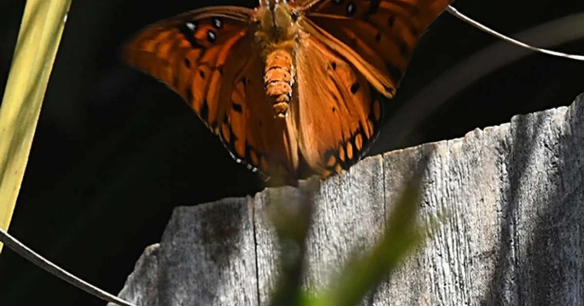 No wall can separate a Gulf Fritillary from its host plant, the passionflower vine (Passiflora).