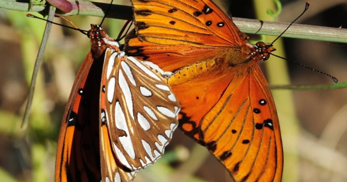 Gulf Fritillaries (Agraulis vanillae) mating on a passionflower vine. (Photo by Kathy Keatley Garvey)