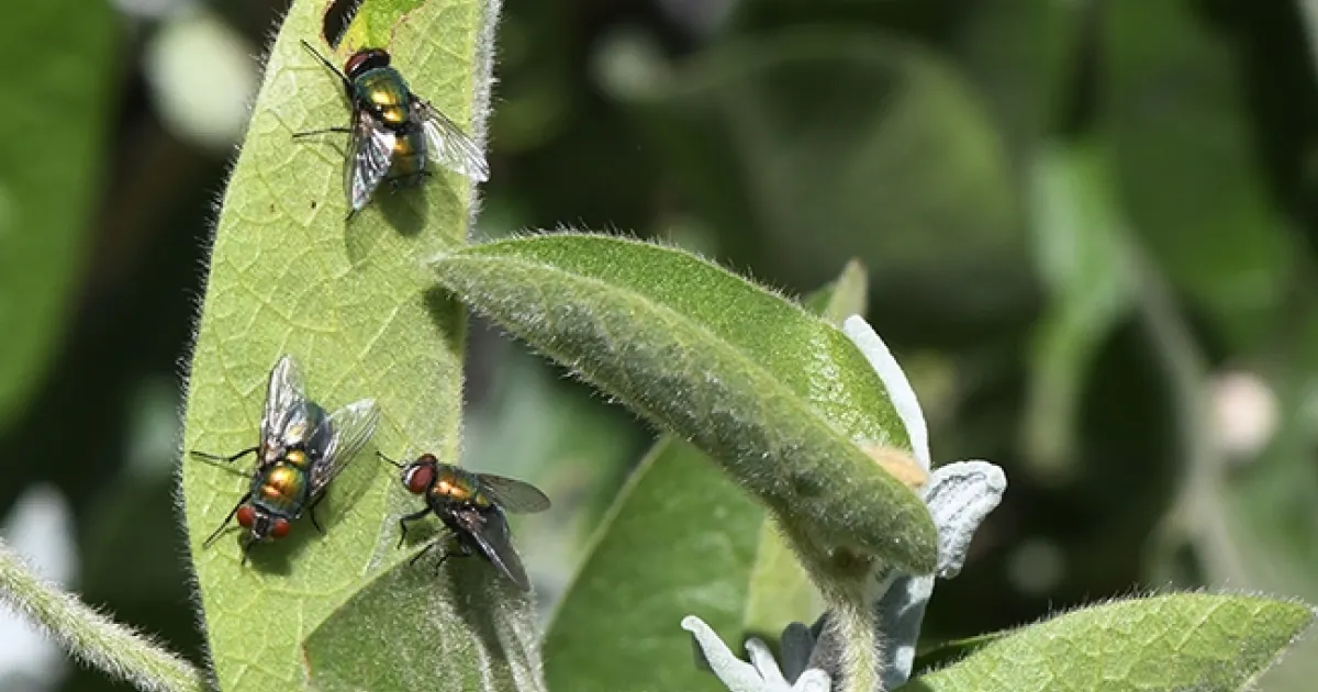 It's Friday Fly Day, so how about three green bottle flies on a catmint leaf? Imsge taken in Vacaville. (Photo by Kathy Keatley Garvey)