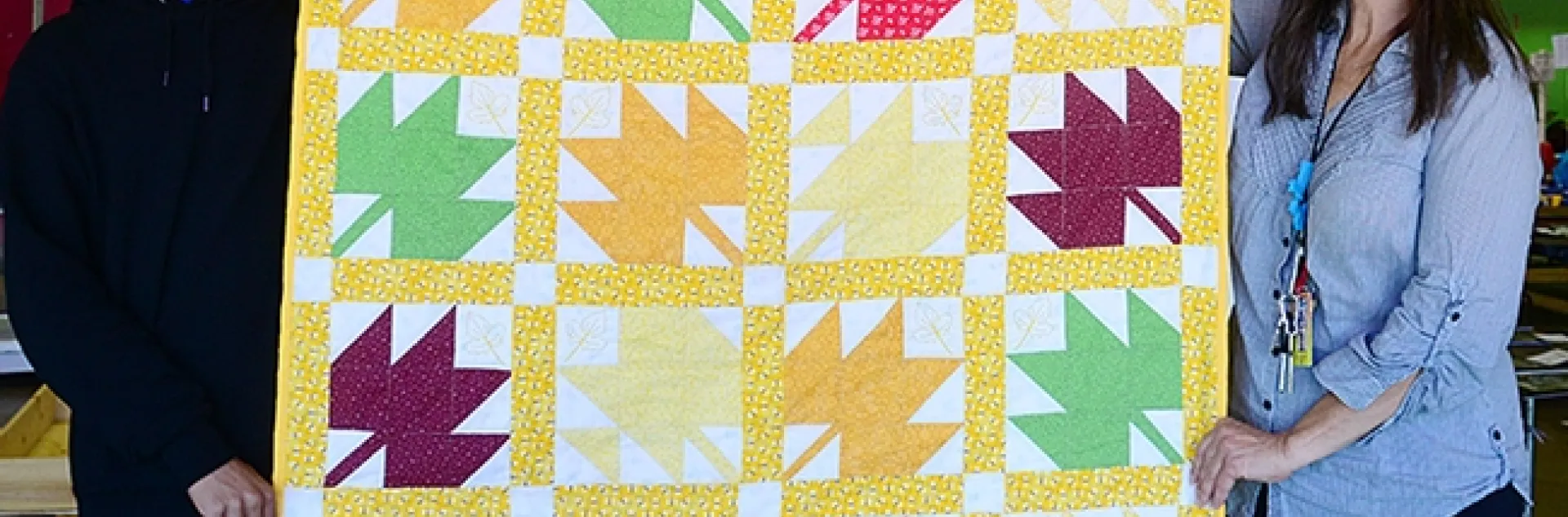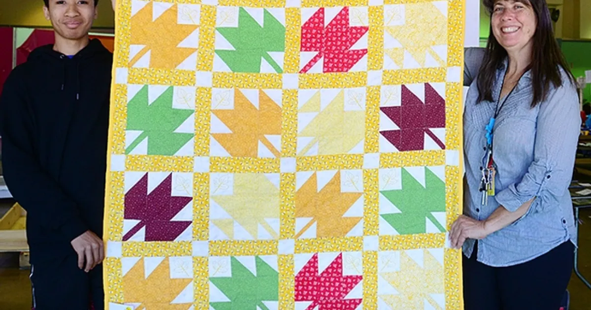 Gloria Gonzalez, superintendent of McCormack Hall, and a community leader with the Sherwood Forest 4-H Club, Vallejo, called attention to the colorful bees framing a 9-patch maple leaf quilt showcased in the adult division. It is the work of Tina Frothy of Vallejo.