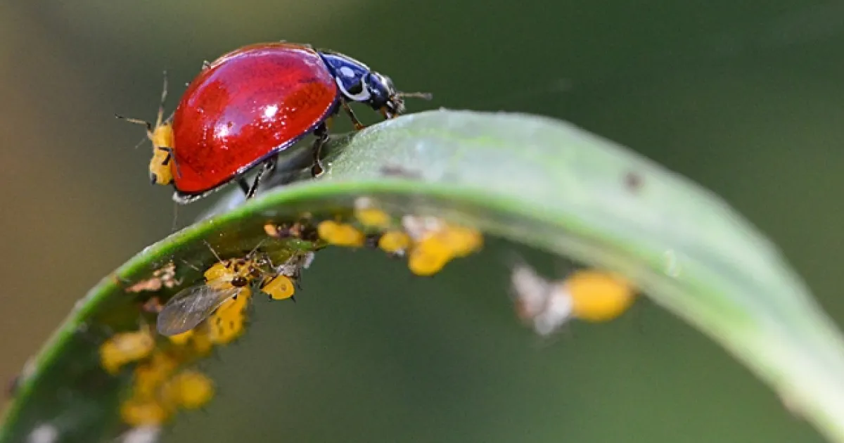 An oleander aphid hitched a ride on the back of a lady beetle. Apparently unaware of the hitchhiker (fast food at that!), the lady beetle kept gobbling up the aphid's relatives in an all-you-can-eat buffet.