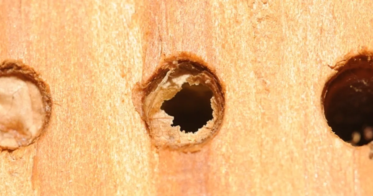 That's what's happening in our bee condo, a wooden block (nest) with drilled holes for leafcutting bees (Megachile).