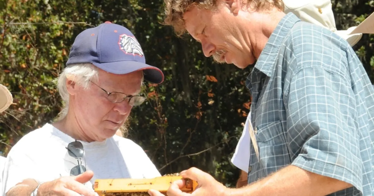 Beekeepers Bill Cervenka (left) of Half Moon Bay and Randy Oliver of Grass Valley check out a frame in Healdsburg during a bee conference.. (Photo by Kathy Keatley Garvey)