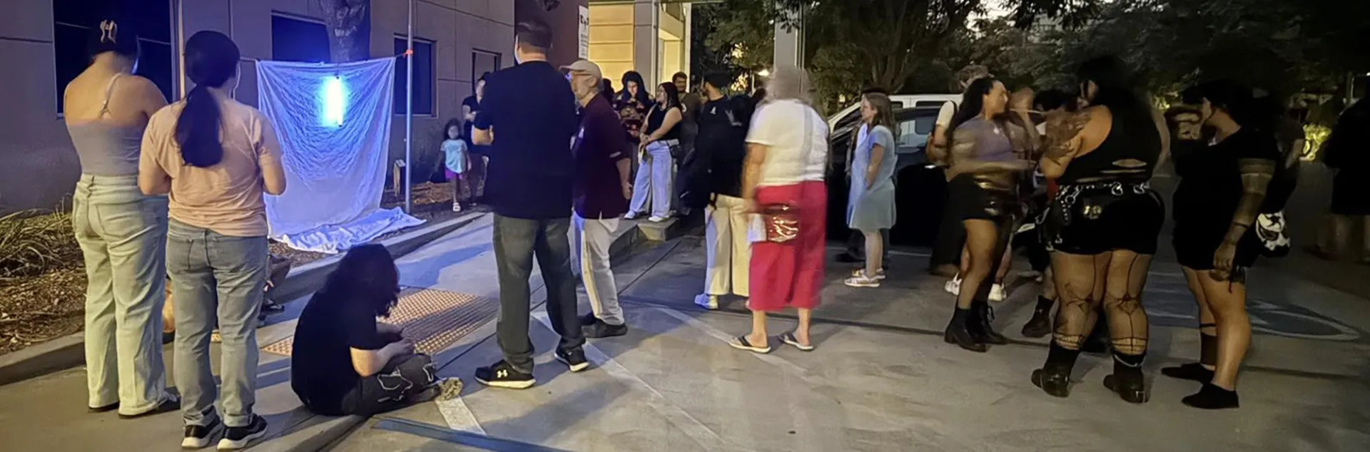 A crowd begins to gather around the blacklighting demonstration. (Photo by Kristy Vasquez)