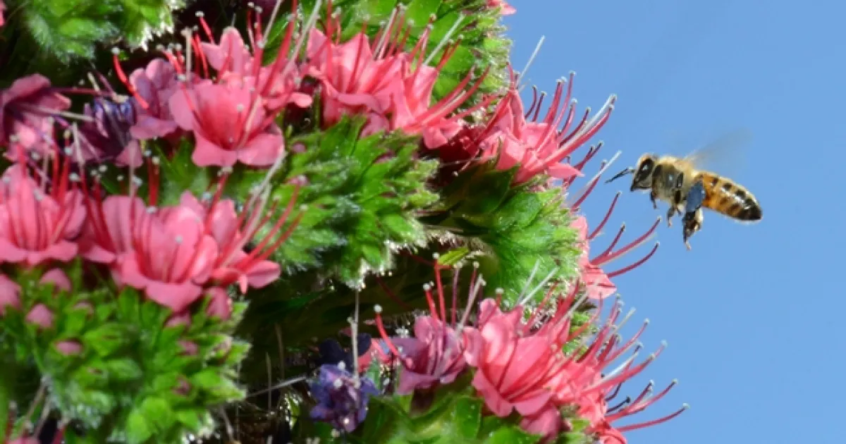 Honey bee packing a load of blue pollen heading for the tower of jewels, Echium wildpretii. (Photo by Kathy Keatley Garvey)