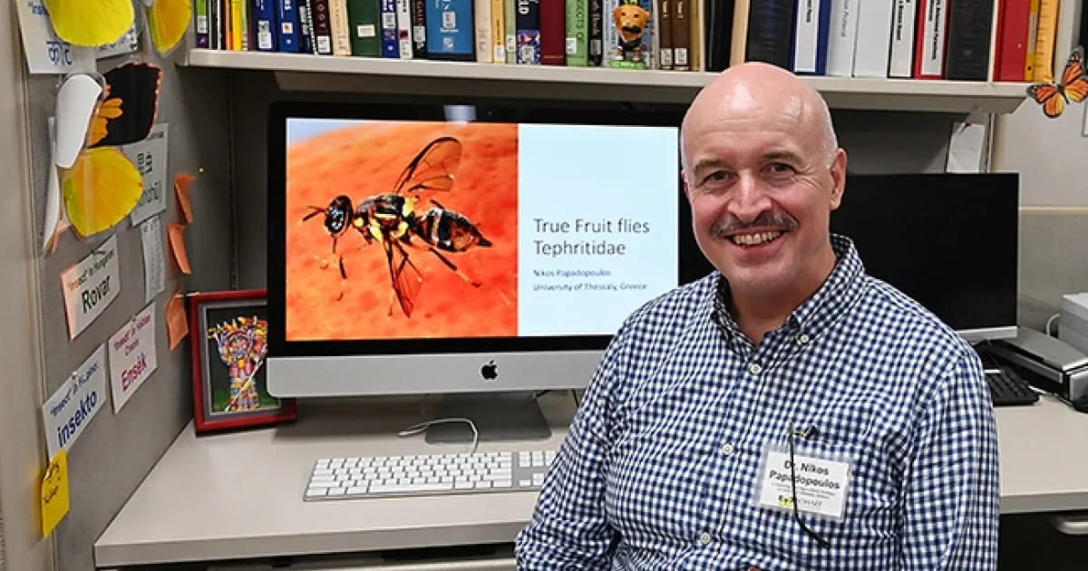 Tephritid fruit fly expert Nikos Papadopoulos of Greece answered questions about tephritid flies at the Bohart Museum of Entomology. (Photo by Kathy Keatley Garvey)