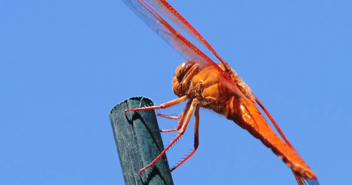 Flame skimmer ((Libellula saturata), outlined against the sky. (Photo by Kathy Keatley Garvey)