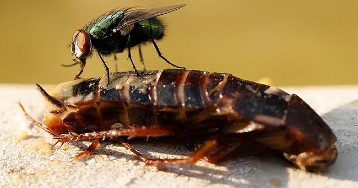 The scenario: a large cockroach drowned in a small water trough located near downtown Vacaville, Calif., and when the water drained, the roach slid out. It proved to be a feast for green bottle flies.