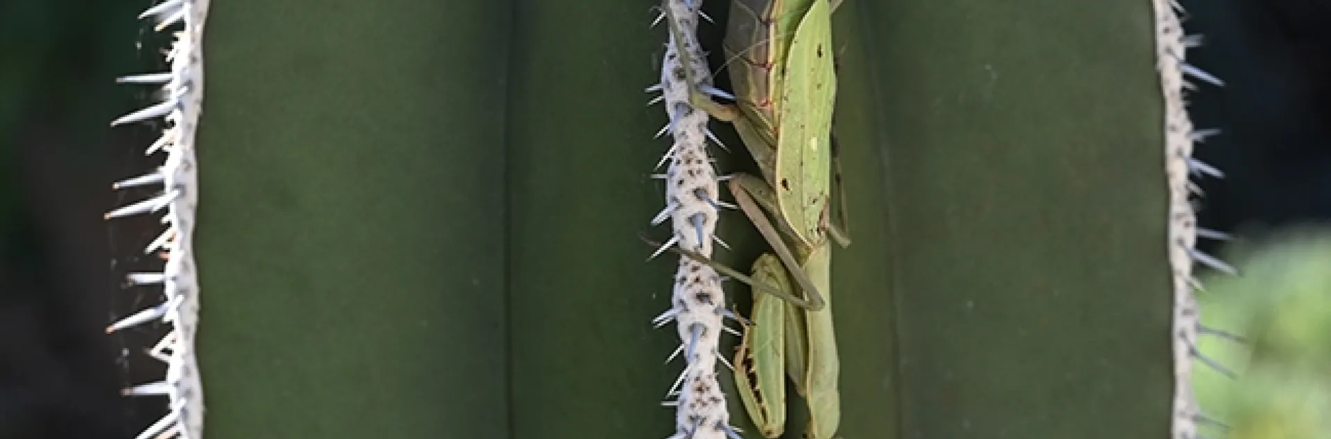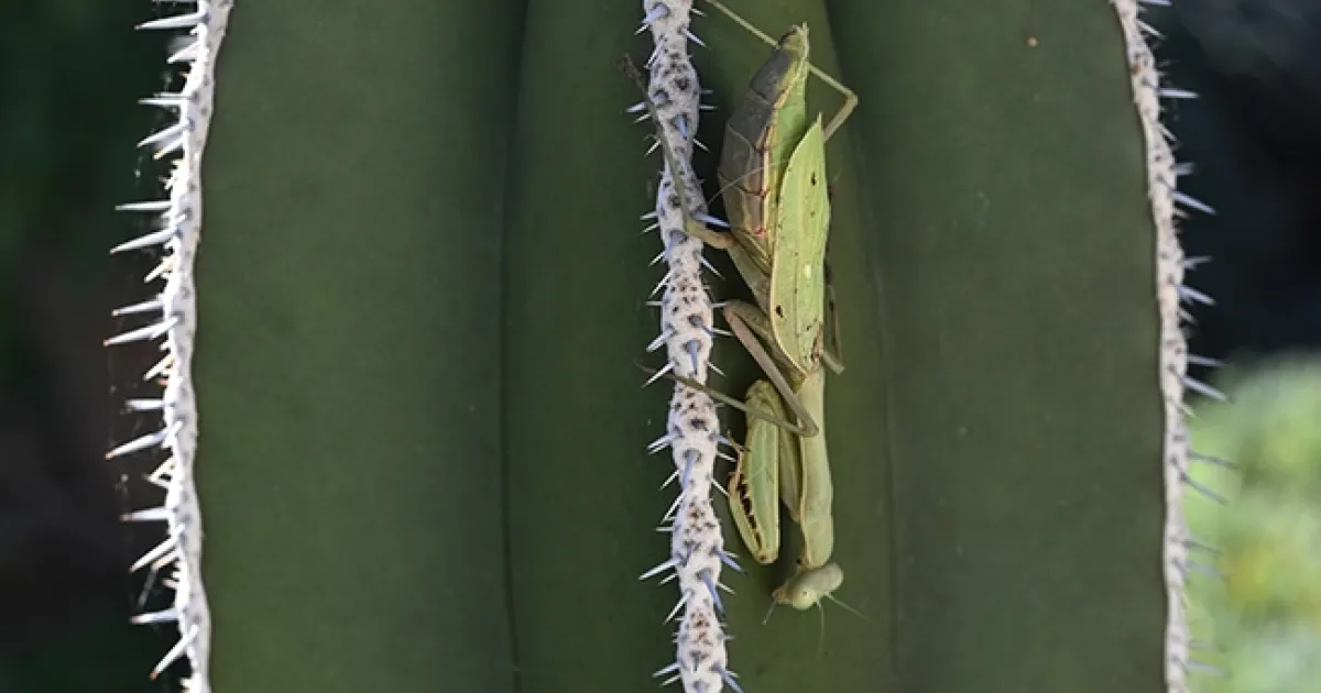 Ms. Mantis is not praying or preying. She is resting. She is clinging to a Pachycereus marginatus, also known as a "Mexican fence post."