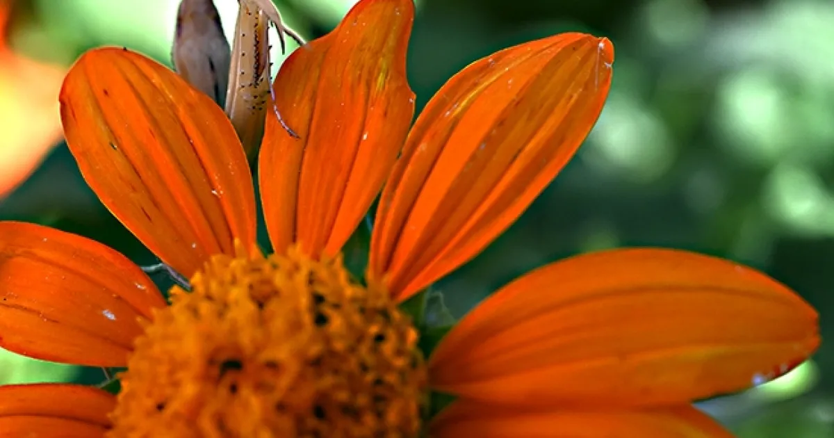 A praying mantis sighting is something like that, but without the music box. You're walking in the garden and suddenly you notice that the Mexican sunflower, Tithonia rotundifola, appears to have an extra petal.
