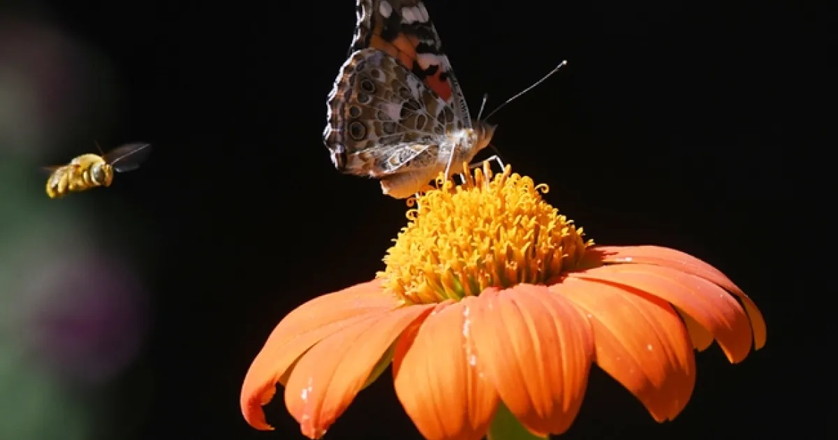 That it does. And if you try to stop the action with your camera, it helps to set the shutter speed at 1/3000 to 1/4000 of a second. (The two images of the bee and painted lady butterfly captured with a Nikon D500 camera, mounted with a 70-180 mm macro zoom lens, with the aperture set at 5.6 and ISO at 800. Image of the bee and monarch taken with a Nikon D800 mounted with a 105mm lens, and with similar settings.)
