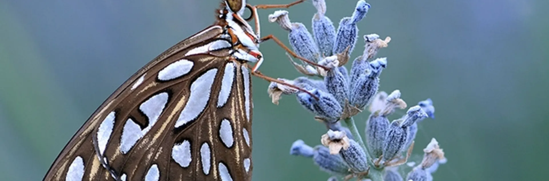 This Gulf Frit probably eclosed at dusk yesterday and then flew several yards from the host plant, Passiflora, to the lavender bed.